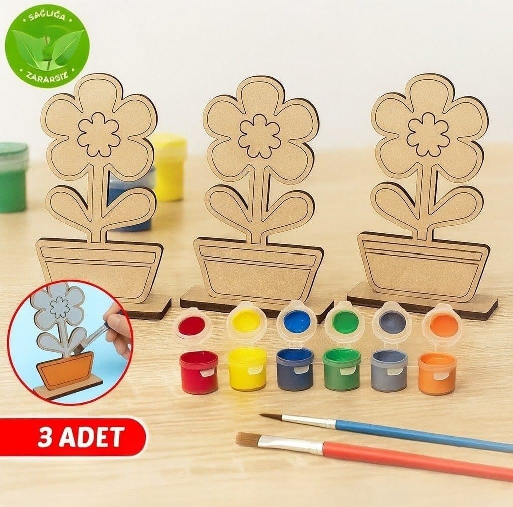 🌼 Ahşap Boyama Çiçekli Vazo Seti – 3’lü Eğlenceli El Sanatı Aktivitesi